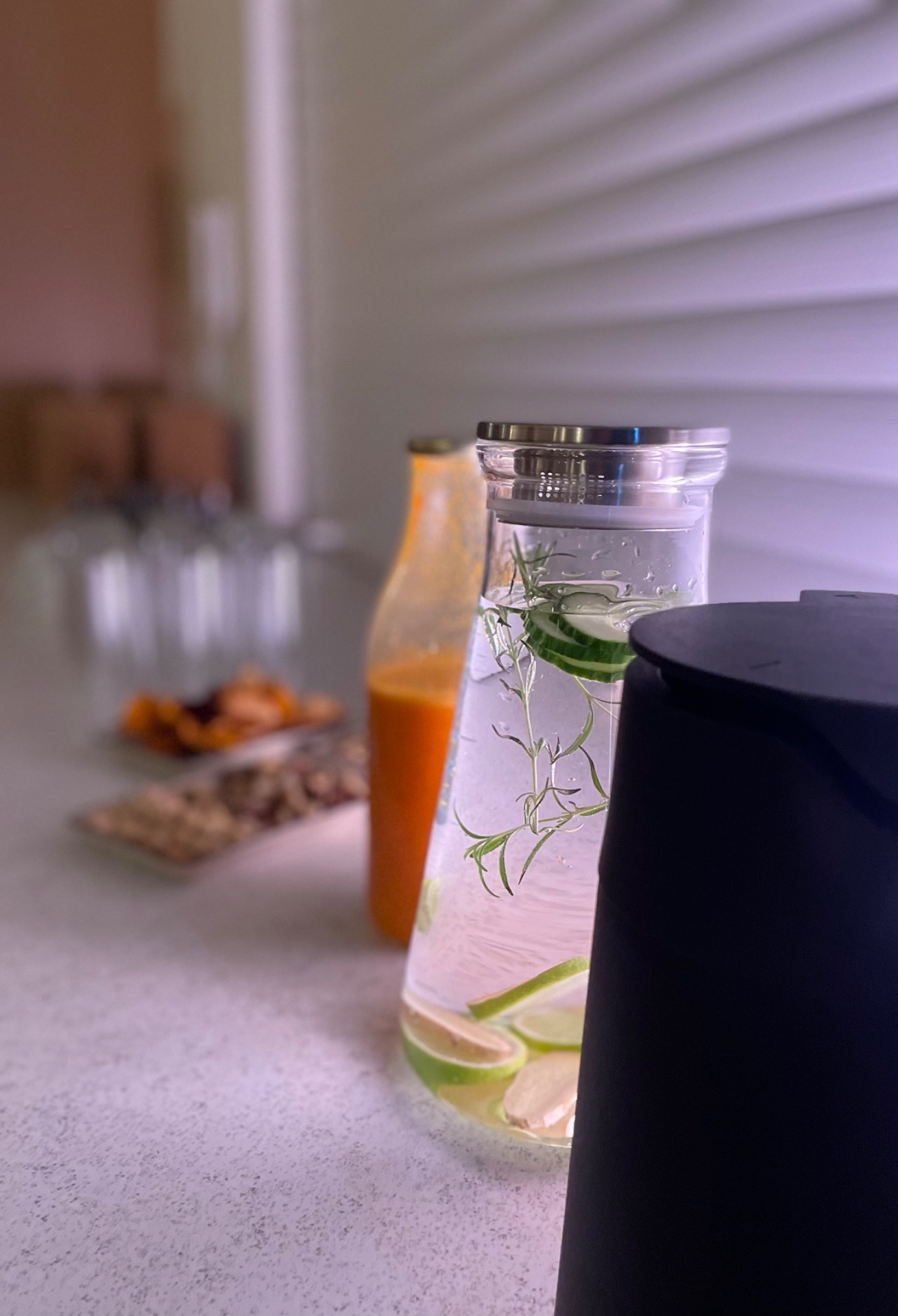 Wasser, Tee und kleine Snacks stehen dir jederzeit zur Verfügung – für einen Moment des Ankommens, Nachspürens oder zum gemütlichen Plaudern. 🌿